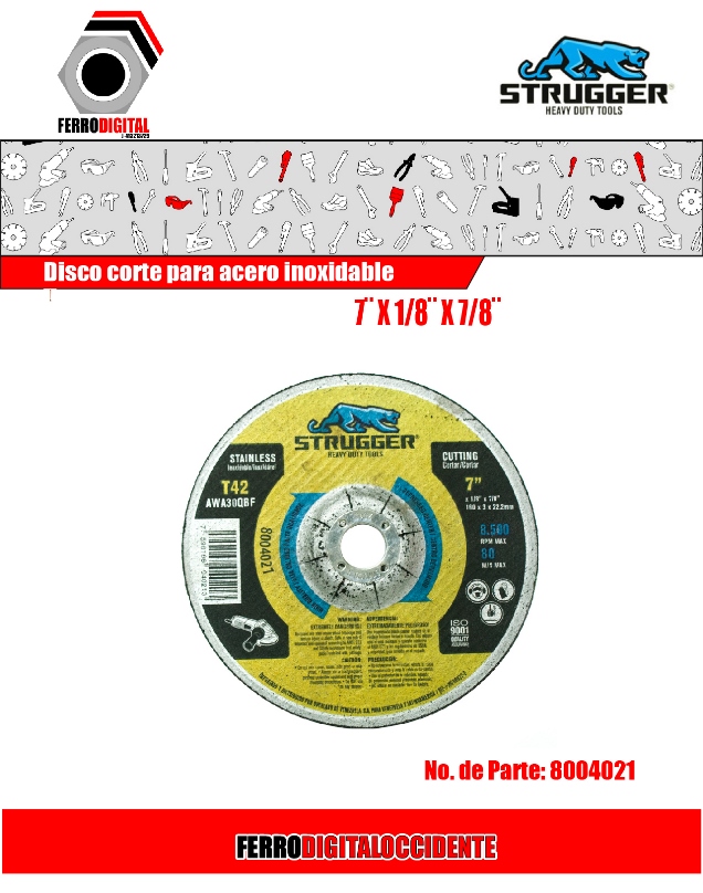 Producto anterior Siguiente producto DISCO DE CORTE PARA ACERO INOXIDABLE 7¨X1/8¨X7/8¨ T42 $ 1,62 DISCO DE CORTE PARA ACERO INOXIDABLE 7¨X1/8¨X7/8¨ T42 cantidad Añadir al carrito Pedir vía Whatsapp SKU: 8004021 Categoría: Herreria Etiqueta: strugger Compartir Descripción Descripción Productos relacionados COD: 05FSA941N Vista rápida Vista rápida HerreriaQto Negro $ 7,48 Añadir al carrito Comprar COD: 8003404 Vista rápida Vista rápida HerreriaCEPILLO.4.1/2″x1/2″x5/8″ ACERO LATONADO 0,50MM 631351-0 $ 10,40 Añadir al carrito Comprar COD: 05FSA514R Vista rápida Vista rápida HerreriaQto Rojo $ 7,48 Añadir al carrito Comprar